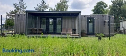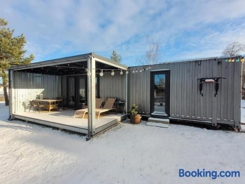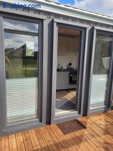 Серед зручностей помешкання Tiny House, яке розташовано в місті Алітус, варто відзначити терасу.