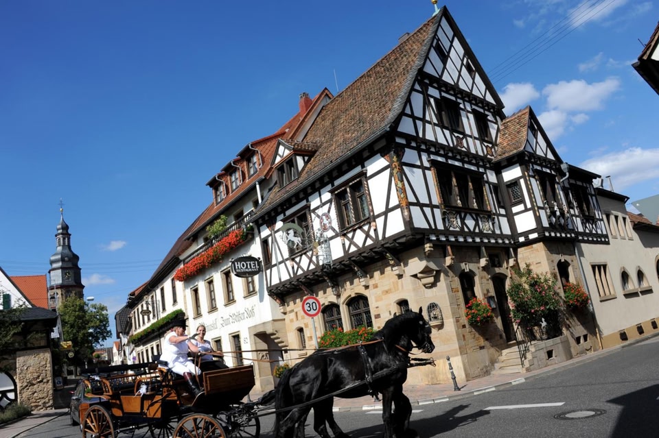 Отель Weinkastell Zum Weissen Ross размещается в традиционном фахверковом здании в центре деревни Кальштадт. К услугам гостей бесплатный WiFi.